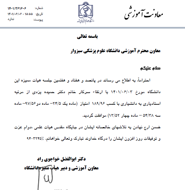 سرکار خانم دکتر حمیده یزدی مقدم ارتقاء شایسته سرکارعالی به مرتبه دانشیاری که نشان از تلاش و پشتکار شما در عرصه آموزش و پژوهش است را صمیمانه تبریک و تهنیت عرض می­‌نماییم.