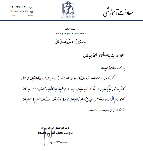 ضمن ارج نهادن به تلاش های خالصانه شما در جایگاه مقدس هیات علمی، دوام عزت و توفیقات روزافزون را از درگاه خداوند تبارک و تعالی خواهانیم.