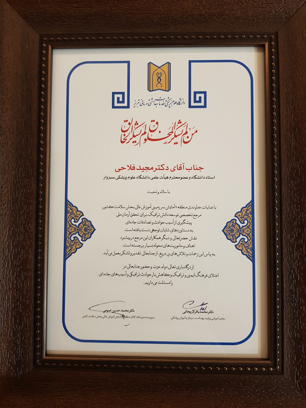 به گزارش روابط عمومی معاونت آموزشی دانشگاه ، این مطلب را مهندس حکمت شعار عضو هیات علمی دانشگاه و مدرس درس ایمنی ترافیک از گروه مهندسی بهداشت حرفه ای دانشکده بهداشت اعلام و اضافه نمود که با توجه به افزایش حوادث جاده ای و از دست رفتن سرمایه های انسانی و اقتصادی کشور که منجر به تحمیل هزینه های بسیار زیادی به کشور می شود ، مرجع تخصصی ایمنی ترافیک کشور مستقر در دانشگاه علوم پزشکی تبریز با هماهنگی شورای عالی انقلاب فرهنگی و وزارت بهداشت درمان و آموزش پزشکی در راستای ارتقاء سطح فرهنگ ایمنی ترافیک و تغییر و اصلاح رفتار در سطح آحاد مختلف جامعه اقدام به تدریس درس ایمنی ترافیک در 17 دانشگاه منتخب کشور(دانشگاه علوم پزشکی ایران - دانشگاه علوم پزشکی شهید بهشتی - دانشگاه علوم پزشکی ارومیه - دانشگاه علوم پزشکی تبریز - دانشگاه علوم پزشکی اردبیل - دانشگاه علوم پزشکی کاشان - دانشگاه علوم پزشکی مراغه - دانشگاه علوم پزشکی همدان - دانشگاه علوم پزشکی گناباد - دانشگاه علوم پزشکی دزفول – دانشکده علوم پزشکی سراب - دانشگاه علوم پزشکی گیلان - دانشگاه علوم پزشکی نهاوند - دانشگاه علوم پزشکی زنجان - دانشگاه علوم پزشکی نیشابور - دانشگاه علوم پزشکی سبزوار - دانشگاه علوم پزشکی مشهد) بصورت پایلوت نموده است ، که در این راستا دانشگاه علوم پزشکی سبزوار به عنوان دانشگاه برتر در سطح کشور انتخاب و سرکار خانم دکتر آگاه و مدرسین این واحد درسی آقایان دکتر فلاحی و مهندس حکمت شعار طی مراسمی در دانشگاه علوم پزشکی تبریز توسط دکتر لاریجانی معاونت آموزشی وزارت بهداشت ، درمان وآموزش پزشکی ، دکتر امامی رضوی مشاور محترم مقام عالی وزارت ، دکتر صومی ریاست دانشگاه علوم پزشکی تبریز و دکتر صادقی رئیس مرجع تخصصی ایمنی ترافیک کشور مورد تقدیر قرار گرفتند