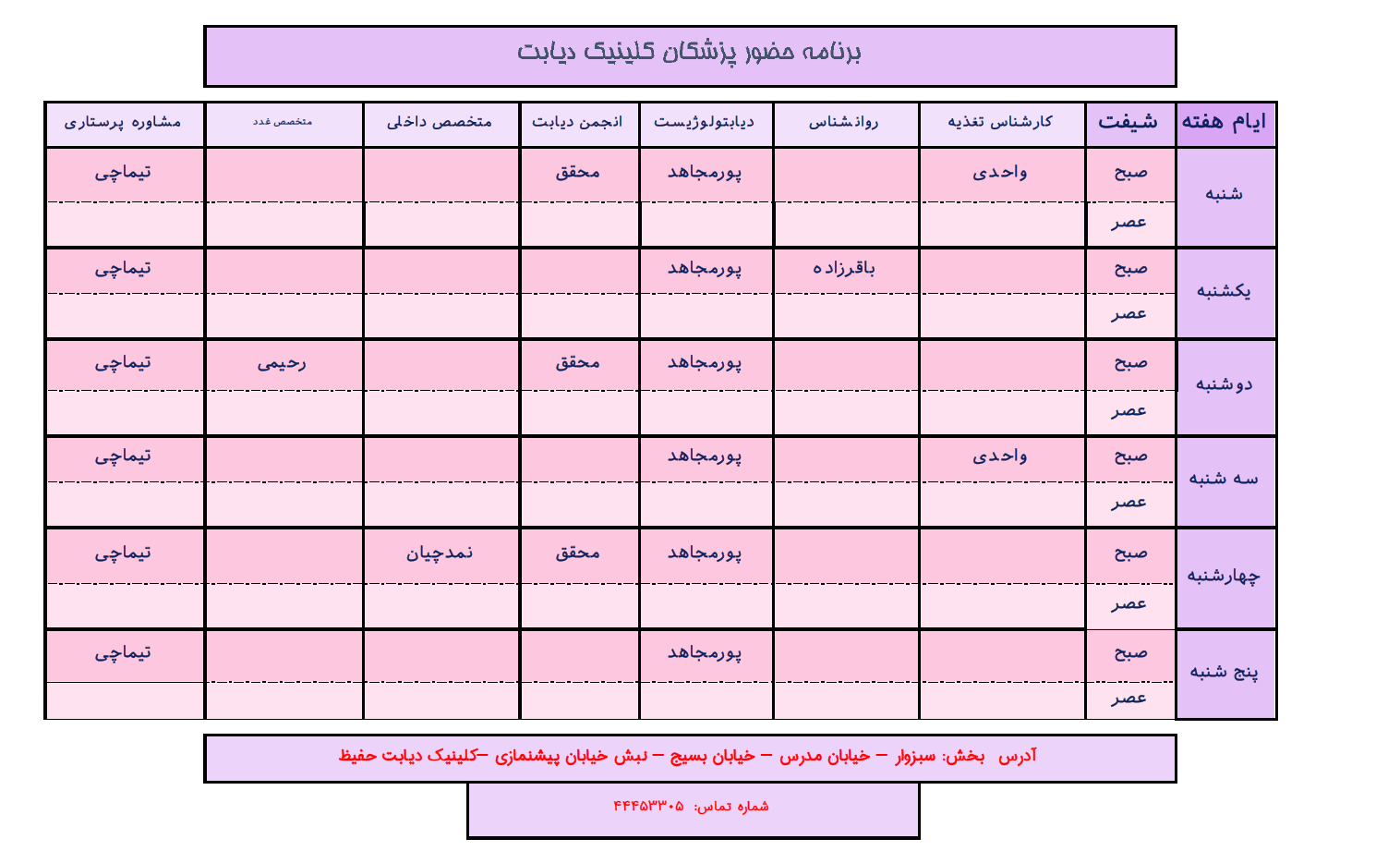 به استحضار همشهریان عزیز می رساند فعالیت کلینیک دیابت شامل خدمات تشکیل پرونده الکترونیک برای تمام مراجعین دیابتی جهت کنترل درمان ، ویزیت پزشک دیابتو لوژیست جهت تجویز دارو و کنترل درمان ،مشاوره پرستاری و تغذیه و...به شرح زیر می باشد.