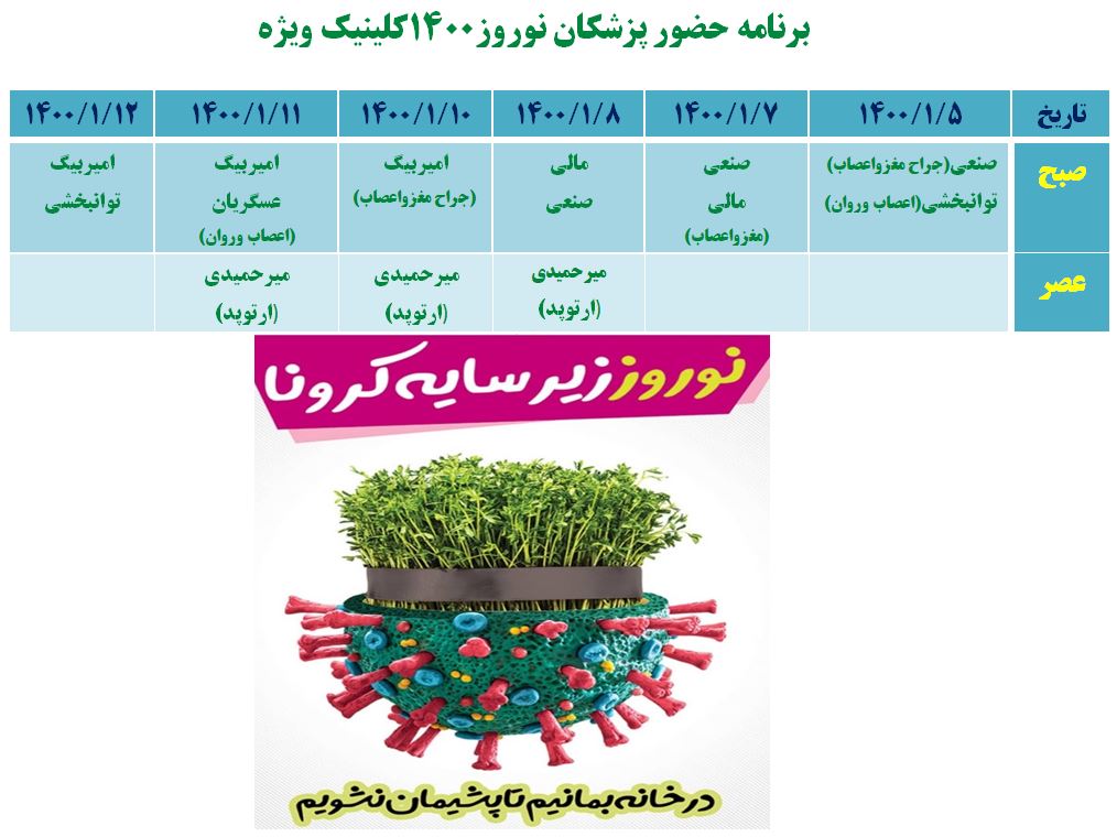 برنامه حضور پزشکان نوروز1400 کلینیک ویژه تخصصی وفوق تخصصی