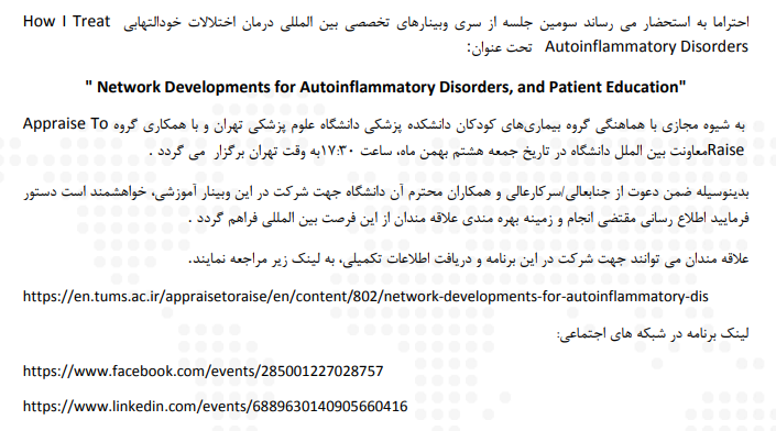 برگزاری سومین جلسه از سری وبینارهای تخصصی بین المللی درمان اختلالات خودالتهابی