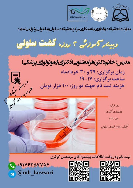 وبینار آموزشی کشت سلولی طی دو روز در مورخ: 29 و 30 خرداد ماه 1401 از ساعت 17 الی 19 با تدریس دکتر زهرا مطلوبی دکترای ایمونولوژی پزشکی برگزار خواهد شد.