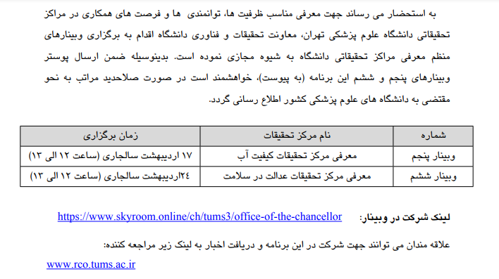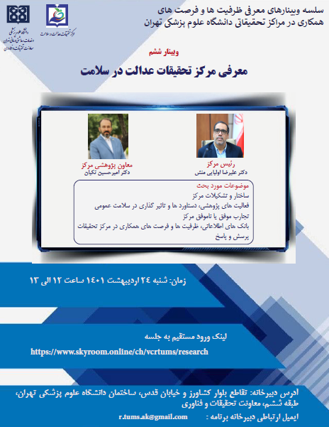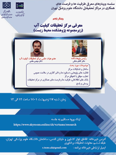 برگزاری وبینارهای منظم در خصوص معرفی مراکز تحقیقاتی دانشگاه علوم پزشکی تهران(17 و 24 اردیبهشت 1401)