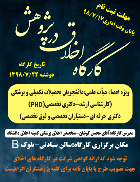 به گزارش روابط عمومی معاونت های آموزشی، تحقیقات و فناوری دانشگاه، کارگاه اخلاق در پژوهش ویژه اعضای هیات علمی، دانشجویان تحصیلات تکمیلی و پزشکی ( کارشناسی ارشد، دکتری تخصصی pHD، دکتری حرفه ای، دستیاران تخصصی و فوق تخصصی ) در دروز دوشنبه، مورخ: 98/7/22 با تدریس استاد محسن کوشان ساعت 8 الی 14 در محل پردیس دانشگاه سالن کنفرانس دکتر سیادتی برگزار می گردد.