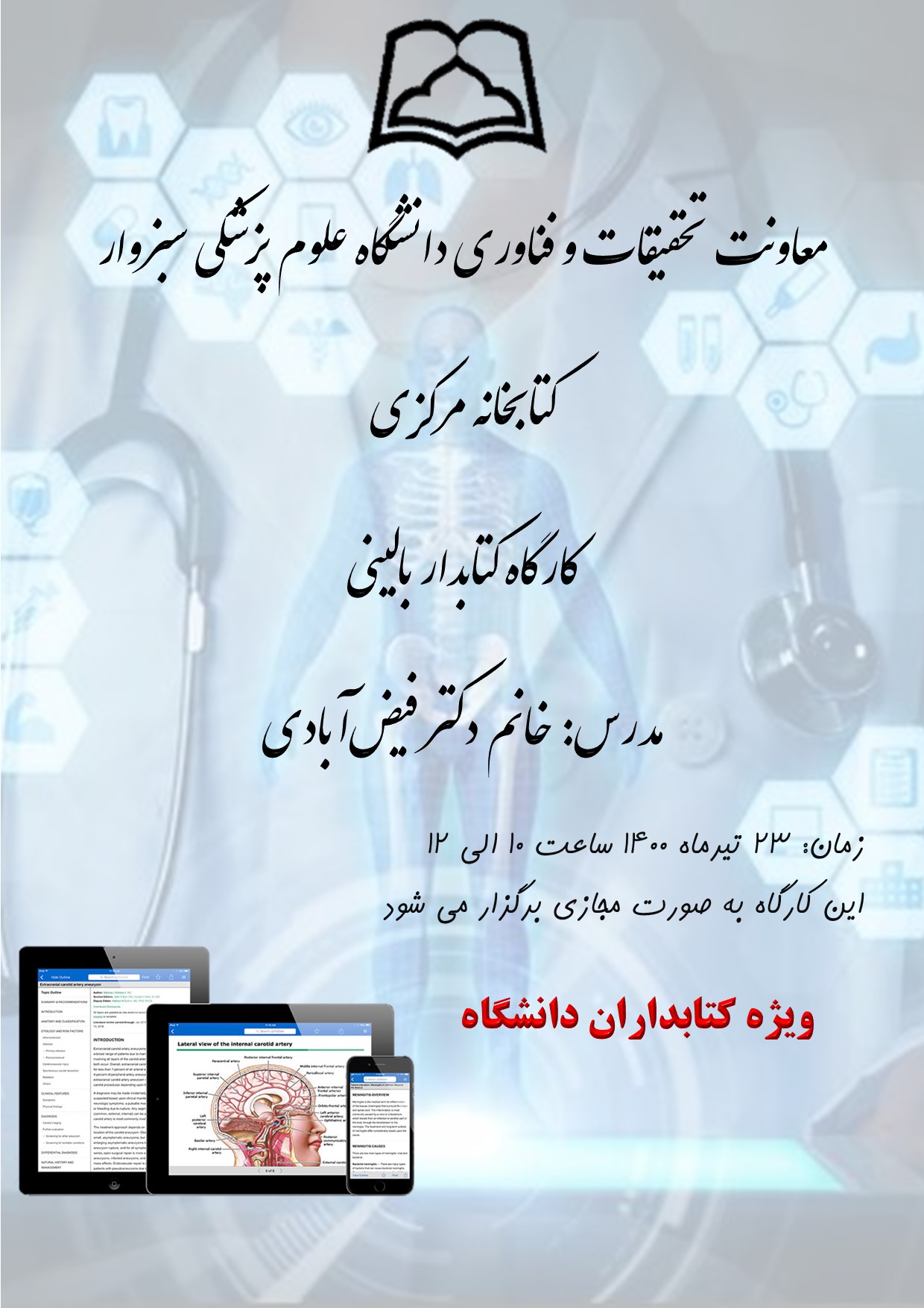 کارگاه کتابدار بالینی چهارشنبه 23 تیرماه برگزار می گردد.