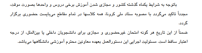 برگزاری کلاس ها به صورت حضوری و فاقد اعتبار بودن هر گونه امتحان غیرحضوری و مجازی برای دانشجویان داخلی یا بین الملل
