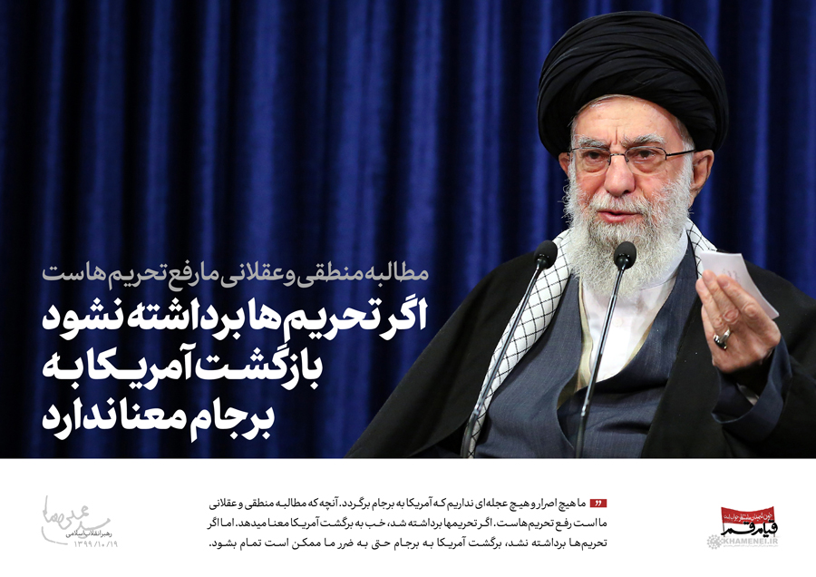 نکتهی اوّل این است که بحث میکنند که آمریکا برگردد به برجام یا برنگردد. ما هیچ اصراری نداریم، هیچ عجلهای نداریم که آمریکا به برجام برگردد؛ اصلاً مسئلهی ما این نیست که آمریکا به برجام برگردد یا برنگردد. آنچه مطالبهی منطقی ما و مطالبهی عقلانی ما است، رفع تحریمها است؛ تحریمها باید برداشته بشود. این حقّ غصبشدهی ملّت ایران است؛ چه آمریکا، چه اروپا -که آویزان به آمریکا و دنبالهرو آمریکا است- وظیفه دارند این حقّ ملّت ایران را اداء کنند. اگر تحریمها برداشته شد، خب آن برگشت آمریکا به برجام معنایی خواهد داشت -البتّه مسئلهی خسارتها هست که جزو مطالبات ما است و در مراحل بعدی دنبال خواهد شد- امّا اگر چنانچه تحریمها برداشته نشد، برگشت آمریکا به برجام ممکن است حتّی به ضرر ما تمام بشود؛ به نفع ما که نیست، [بلکه] به ضرر ما هم ممکن است باشد. البتّه بنده به مسئولین، هم در قوّهی مجریّه و هم در قوّهی مقنّنه، گفتهام که در این زمینهها با دقّت و رعایت کامل ضوابط پیش بروند و عمل کنند.