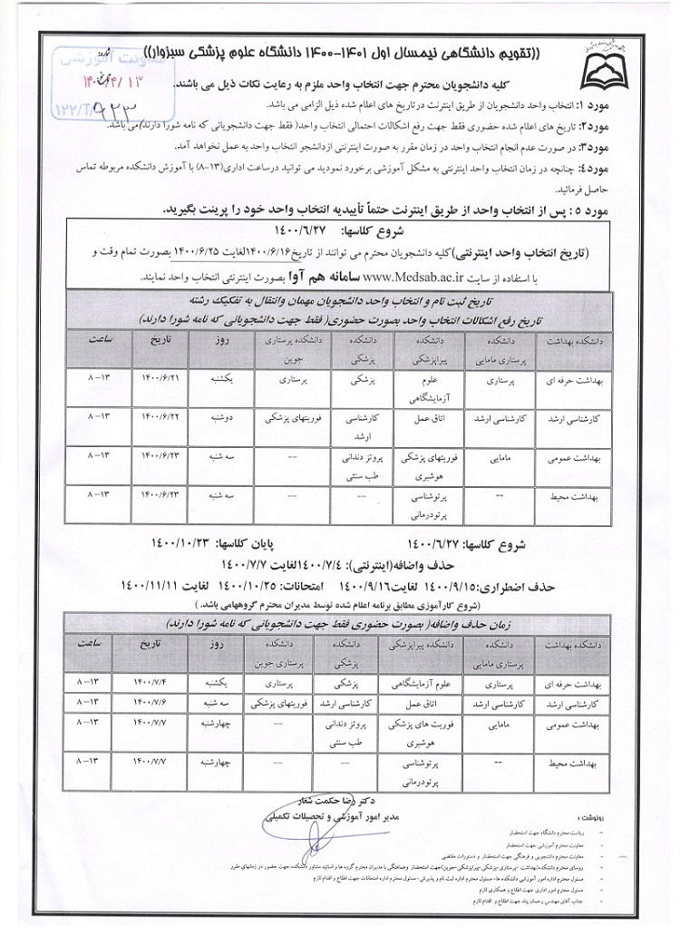 تصویب تقویم آموزشی نیمسال اول1401-1400 در شورای آموزشی دانشگاه علوم پزشکی سبزوار