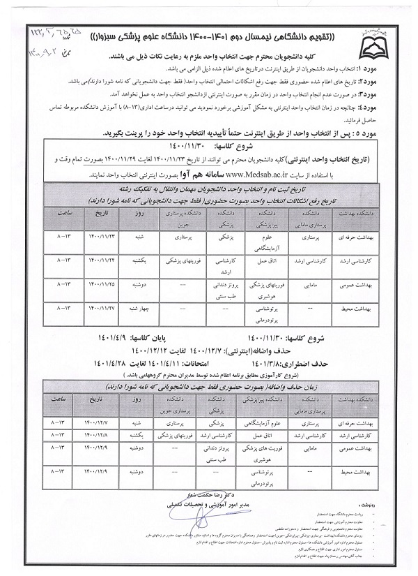 تقویم آموزشی نیمسال دوم 1401 – 1400 دانشگاه ، مصوبه جلسه شماره 175 شورای آموزشی