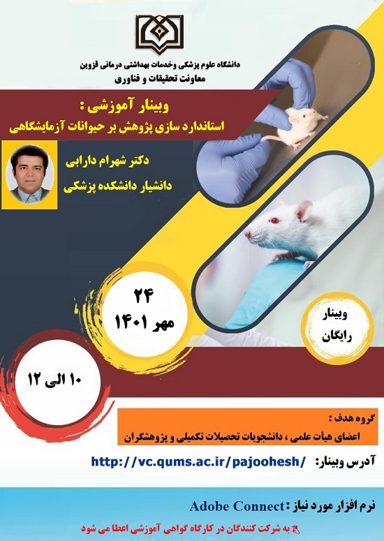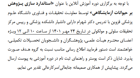 دوره آنلاین «استاندارد سازی پژوهش بر حیوانات آزمایشگاهی» علوم پزشکی قزوین 24 مهر 1401