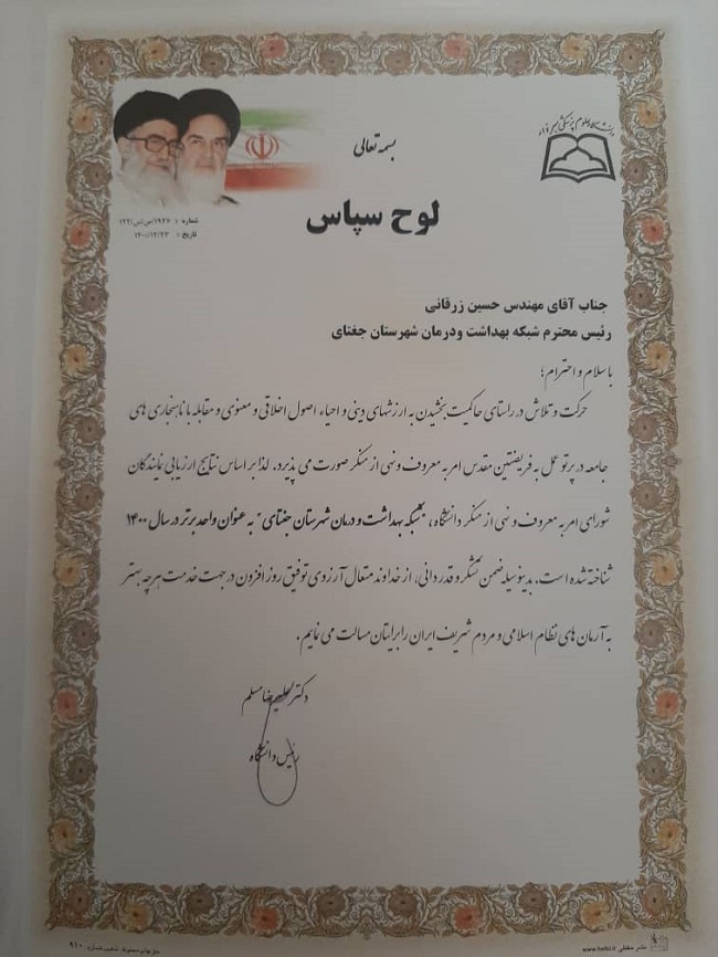شبکه بهداشت شهرستان جغتای به عنوان واحد نمونه در حوزه امر به معروف و نهی از منکر ۱۴۰۰ دانشگاه معرفی شد.