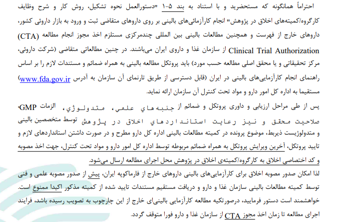 ضرورت اخذ مجوز CTA از سازمان غذا و دارو برای اجرای کارآزمایی بالینی داروهای خارج از فارماکوپه ایران
