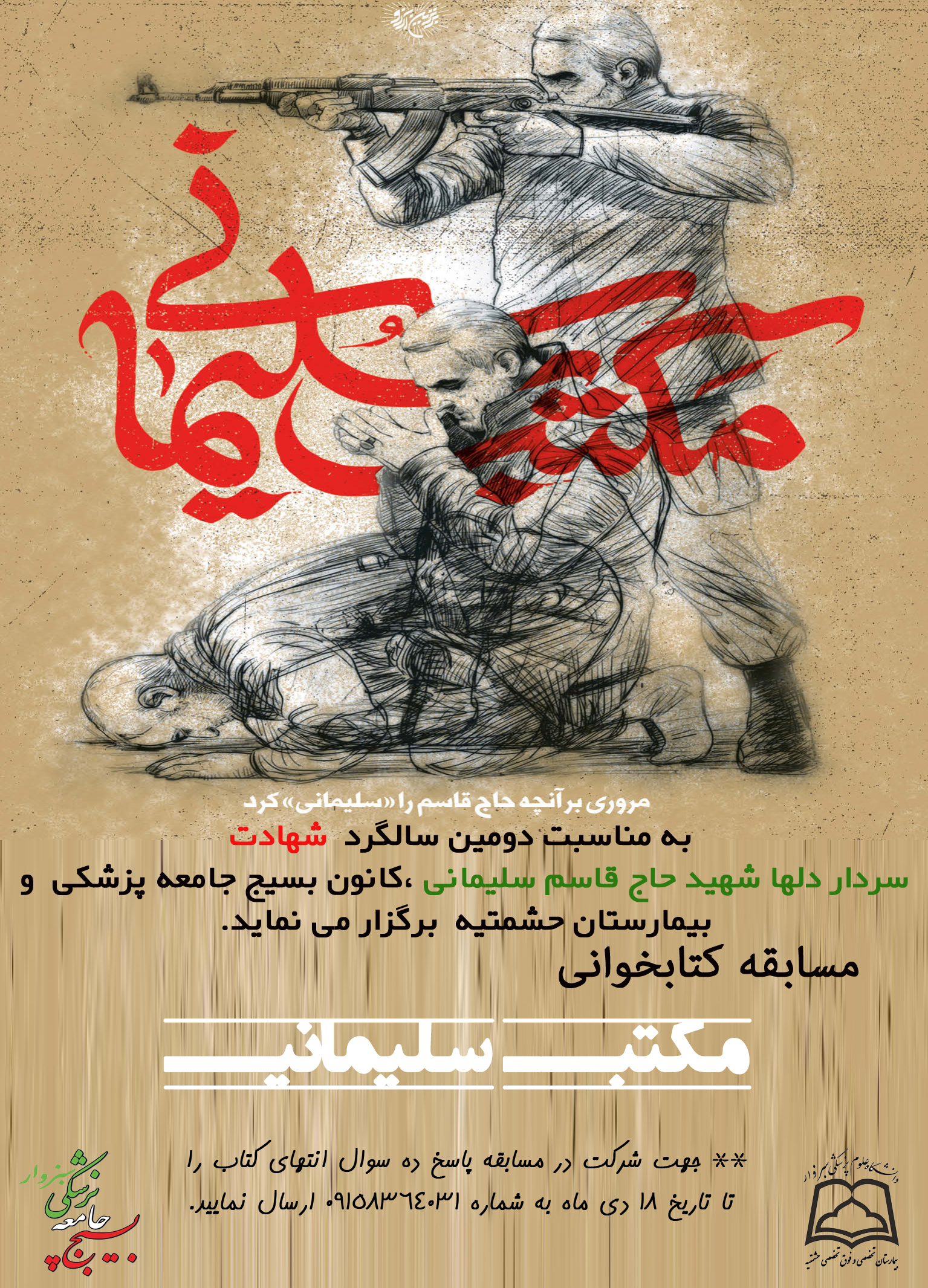 به مناسبت دومین سالگرد شهادت سردار سلیمانی  کانون بسیج جامعه پزشکی و بیمارستان حشمتیه  مسابقه کتابخوانی  مکتب سلیمانی را برگزار می نماید.