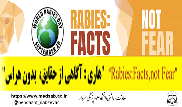 روابط عمومی معاونت بهداشتی /  دکتر فاطمه نوده معاون بهداشتی دانشگاه علوم پزشکی سبزوار ضمن اشاره به اهمیت 28سپتامبر مصادف با 6 مهرماه سال جاری بعنوان روز جهانی هاری گفت: افزایش آگاهی در مورد بیماری هاری و کمک به جهان برای مبارزه با این بیماری بسیار مهلک وکشنده  با تاکید برشعار امسال یعنی " هاری: آگاهی از حقایق، بدون هراس" با تمرکز برسه اصل: