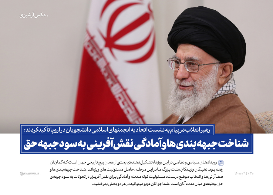 حضرت آیت‌الله خامنه‌ای در پیامی به پنجاه وششمین نشست اتحادیه انجمن‌های اسلامی دانشجویان در اروپا، با اشاره به تحولات سیاسی و نظامی اخیر، بر شناخت جبهه‌بندی‌ها و انتخاب موضع درست و آمادگی برای نقش‌آفرینی در تحولات به سود جبهه حق تأکید کردند.